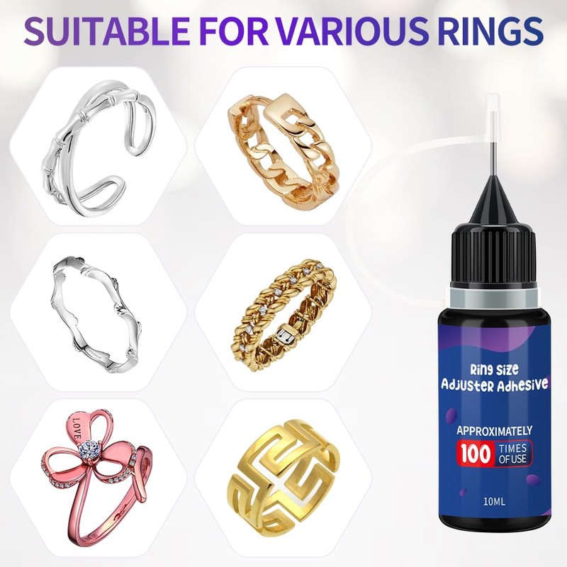 - Ring Adjuster Complete Kit - Ring size adjuster set includes a 10ml ring adhesive, a UV lamp and a polishing cloth. Easy to use, effectively protect your ring from loosening and falling off.