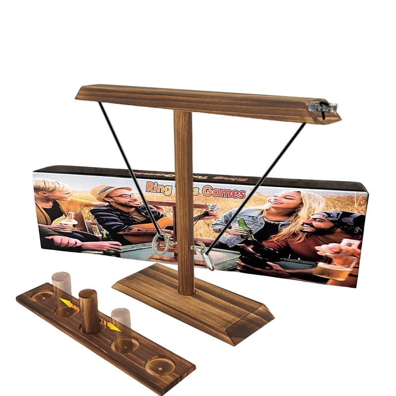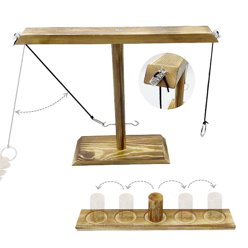 - Fun Game: The 2-player game is to place the wooden cup in the middle of the circle, pick up the circle and go! For each hook you take, move the wooden cup 1 space towards your opponent. The player wins when the wooden cup is moved away from the end of the ladder. Agree on a bet with your competitor before the game and play each style of game.
