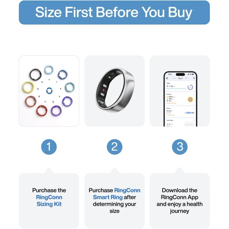 [Size Before You Buy] Before purchasing the RingConn Smart Ring, we highly recommend acquiring the RingConn Sizing Kit to determine the most comfortable and suitable size for your finger. Please note that the RingConn Sizing Kit is only compatible with the RingConn Smart Ring