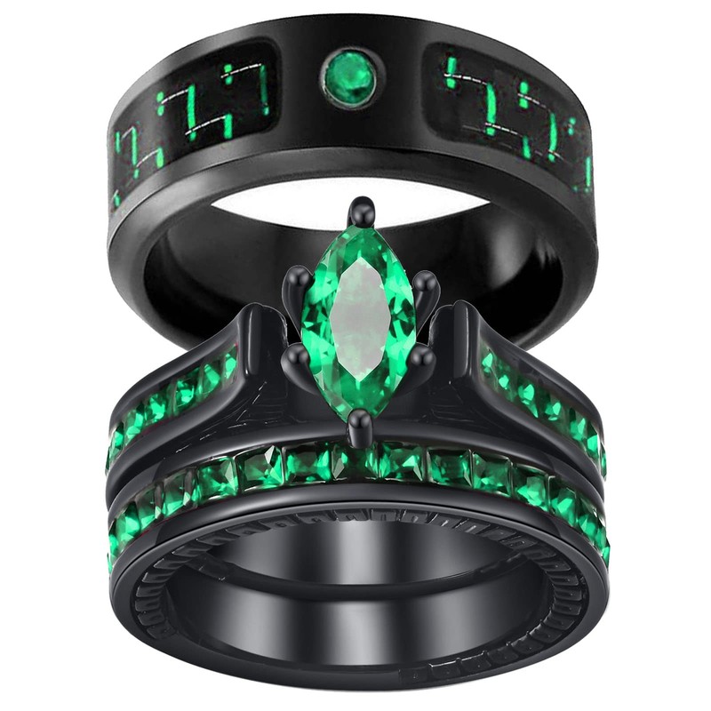 - HIGH-QUALITY couple rings:Women's Ring is black gold plated marquise cut aaa green cz wedding Ring sets,engagement ring.Mne's ring is 8mm wide titanium steel green cz mens wedding band,wear resistant, anti-collision.