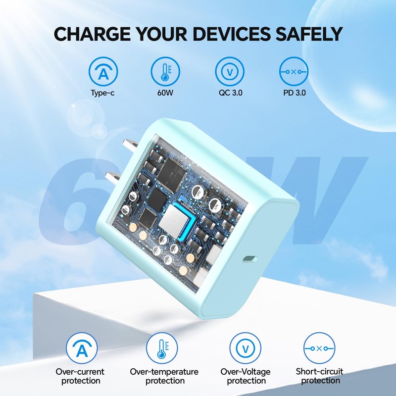 The 60W Type C wall charger block charges your phone up to 60% in just 30 minutes, and the 60W PD USB C charger block is 3 times faster than the original 5W PD adapter.