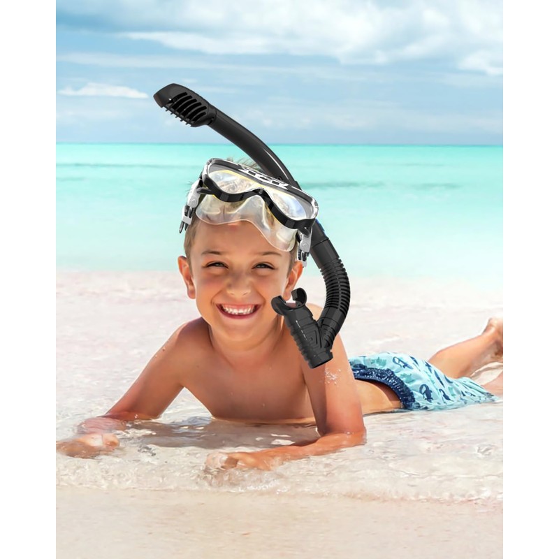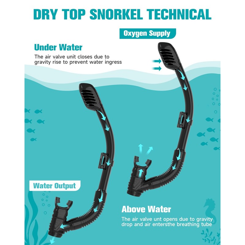 - Fully dry ventilation pipe: the valve of the snorkel suit for children adopts a conical design, and when the ventilation pipe comes into contact with air, the conical part can sink immediately. Air can flow into ventilation ducts in time to ensure your breathing. Once the pipeline is underwater, the inlet of the pipeline is closed by a floating ball. A completely dry system ensures that your child can breathe freely in the water.