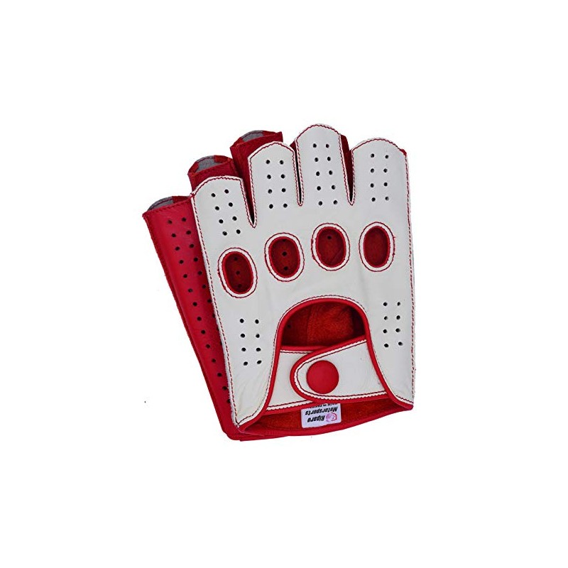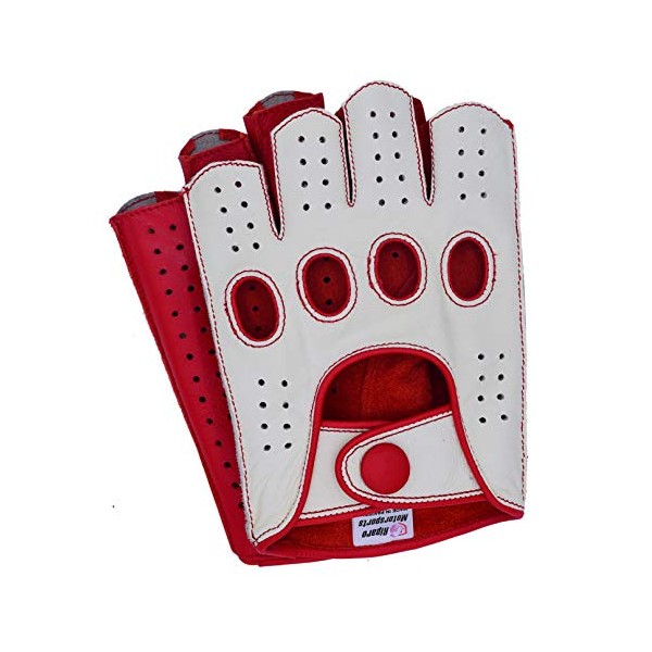 Riparo Mens Leather Reverse Stitched Fingerless Half-Finger Driving Motorcycle Gloves (Large, White/Red)