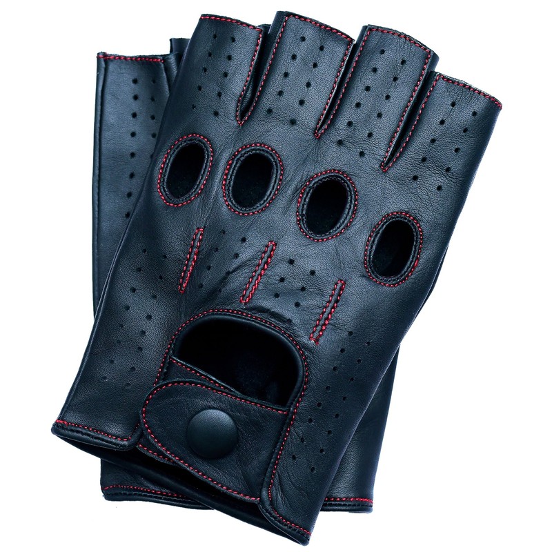 Riparo Motorsports Men's Fingerless Half Finger Driving Fitness Motorcycle Cycling Unlined Leather Gloves (Small, Black/Red Thread)