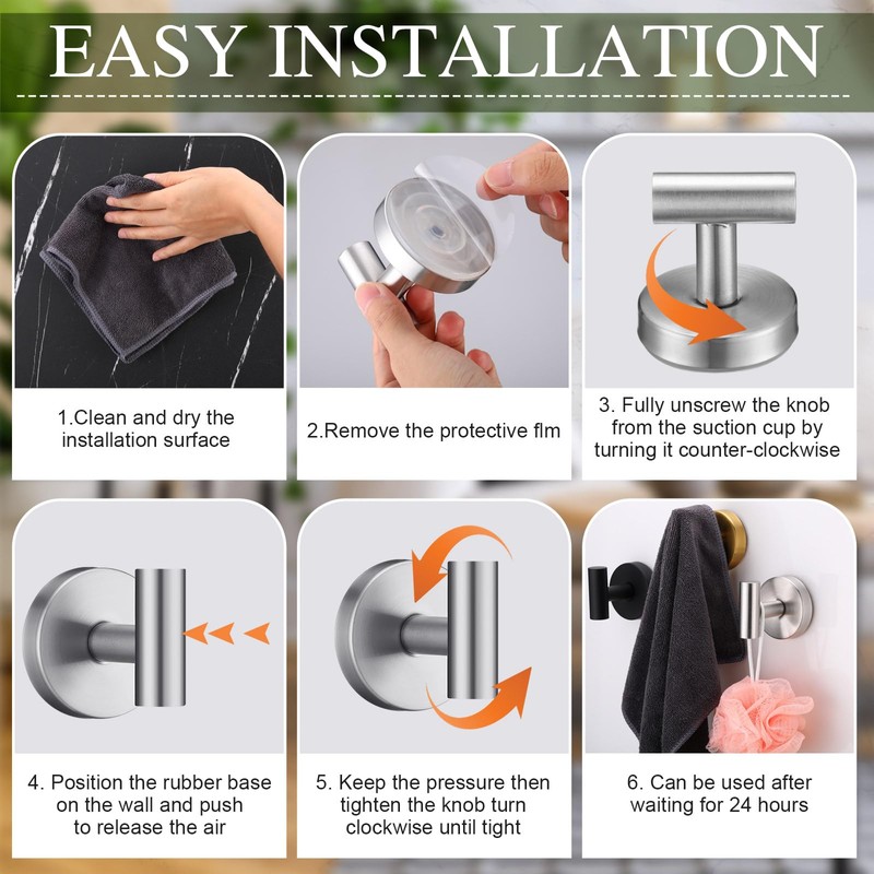 - Effortless Installation: designed for simplicity, these reusable hooks require no tools or screws, just a simple manual rotation secures them to the wall with a firm grip; Ideal for renters or those who love to rearrange, these bathroom hooks leave no residue or markings on surfaces when removed, preserving your interior's pristine condition; Whether you're accommodating bathroom towels or kitchen essentials, enjoy a seamless look without any fuss