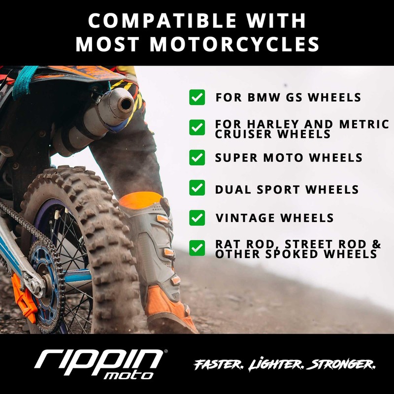 • Compatible with Harley-Davidson, Honda, Yamaha, Kawasaki, Suzuki, KTM, Duke, Husaberg, Husqvarna, BMW, Aprilia, Triumph, Piaggio, Ducati, MV Agusta, Moto Guzzi, Benelli, Buell, CF-Moto, Enfield, Hyosung, Indian, Beta, GASGAS, Sherco etc., or any other spoked wheels.