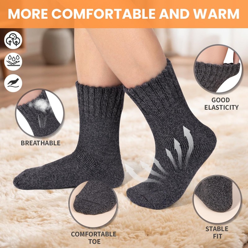 - Thick & Warm Winter Socks: 5 pairs of men's premium wool thermal socks, made from 53% merino wool, 24% cotton, 16% polyester, and 7% spandex. The extra-thick design provides superior warmth while maintaining softness, breathability, and moisture-wicking properties. Specifically engineered for extreme cold, these men's wool socks deliver exceptional insulation. One size fits UK 6-12 / EU 38-45.