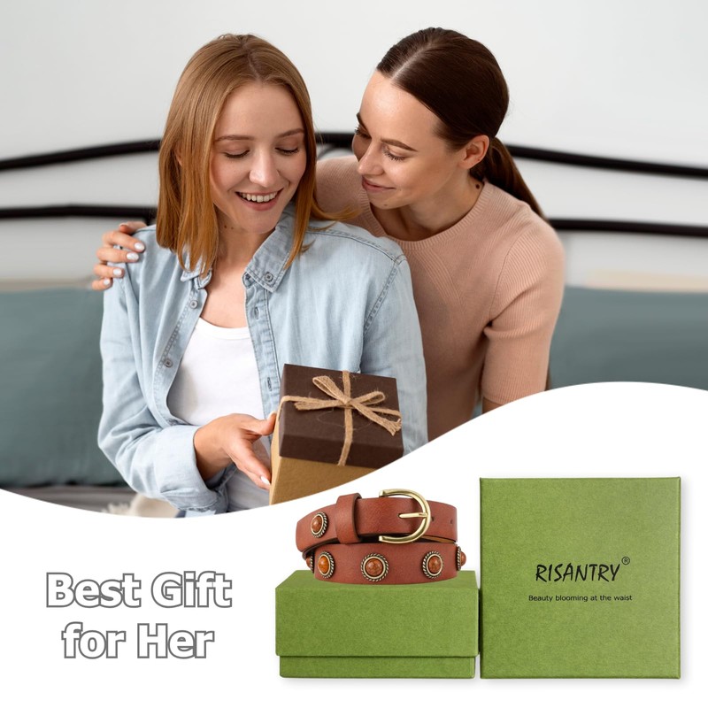 RISANTRY Women's Brown Rivet Belt with Gold Buckle Punk Studded Belt for Jeans Pants Dresses