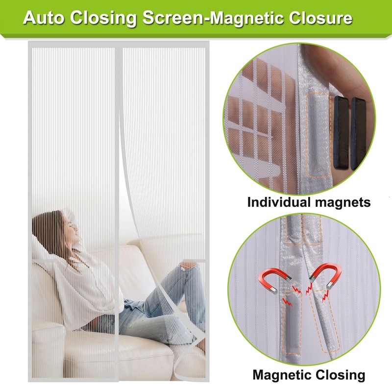 - Powerful Magnets Self Sealing: As built-in more than 34 strong magnets, Door screen magnetic closure can open easily and close automatically, it close back together immediately and seamlessly after you walk through, friendly to children and pets