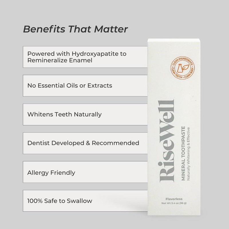 RiseWell's flavorless all natural toothpaste is ideal for those sensitive to tastes and looking for natural teeth whitening. Free from artificial sweeteners, essential oils, and flavors, it offers gentle, effective cleaning without taste. This tasteless toothpaste is perfect for sensitive teeth, it reduces sensitivity while effectively remineralizing enamel for a healthier, brighter smile. This clean toothpaste is made with 100% clean and safe ingredients, our sensitive teeth whitening toothpaste contains no harmful chemicals like SLS, propylene glycol, artificial flavors, or dyes - ensures safe, everyday care! Proudly made in the USA, RiseWell's unflavored toothpaste for adults is gluten-free, vegan, and cruelty-free, combining effective care with ethical standards. For sparkly results, brush in gentle, circular motions for 2 minutes, three times a day. For optimal results, we recommend our simple, 3 step oral care routine: Floss, Rinse and Brush (with no spitting). Achieve a sparkling, healthy smile with our made by dentist toothpaste!