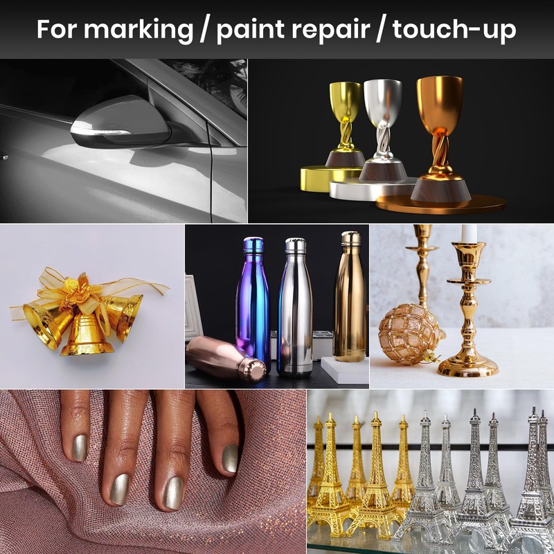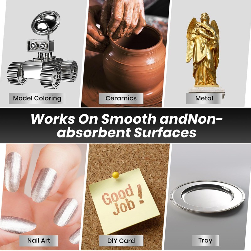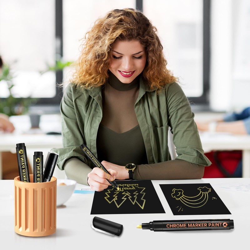 Our metallic chrome markers feature a unique, highly pigmented ink with a premium high gloss liquid chrome finish. They offer excellent coverage, anti-UV properties and strong coverage. With an amazing mirror effect that stays shiny for a long time, these markers offer impressive water resistance and colour stability once the ink has dried. Create stunning, vibrant highlights that won't fade with our Metallic Chrome Markers.