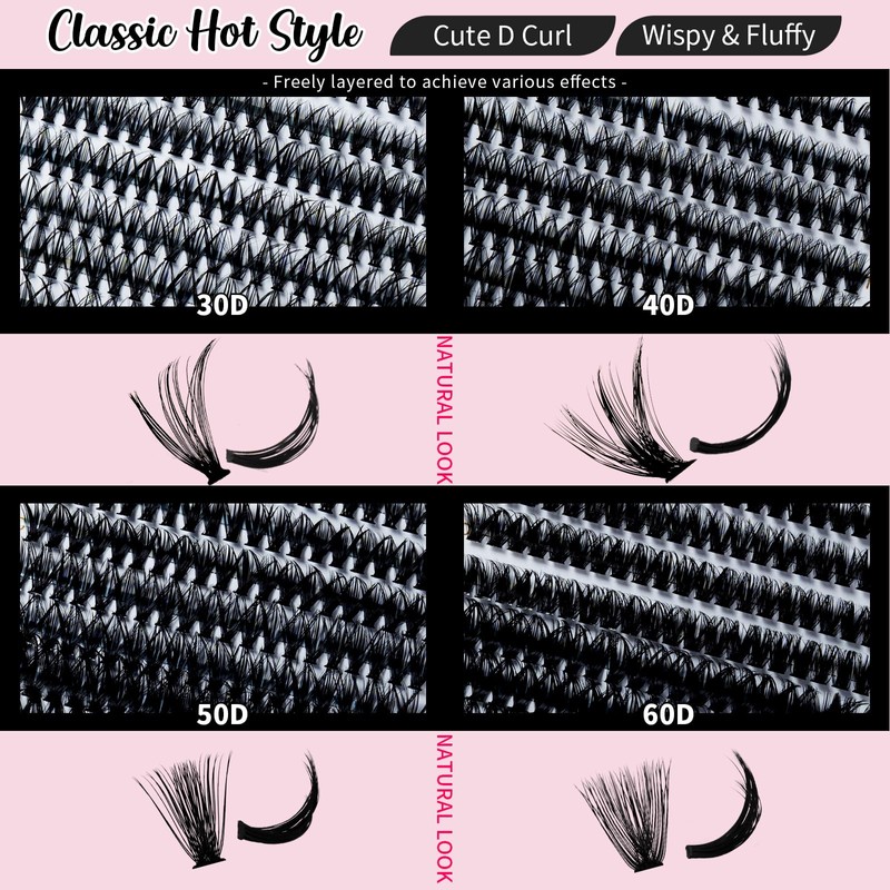 - DIY Lash Looks Now: Customizable to fit any eye shape, you can use different lengths of eyelash clusters to create more style possibilities - cat-eye, fan-eye, doll-eye, dramatic-eye, natural, fluffy, and more. Achieving the perfect extension look with our diy lash extension kit