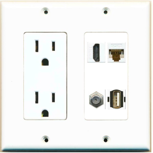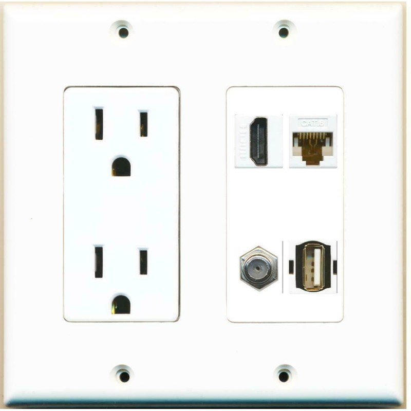 RiteAV [ 2 GANG ] 15A Duplex Power Outlet HDMI Coax Cable CAT6 LAN USB Wall Plate