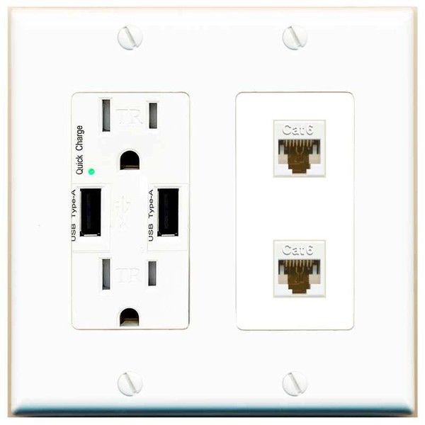 RiteAV 2 Port Cat6 Ethernet Wall Plate - USB Charger [White/White]
