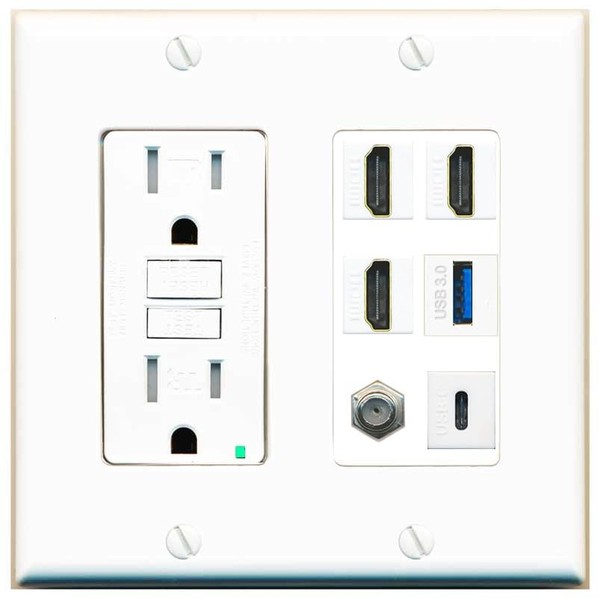 RiteAV 3 HDMI USB3 USBC Coax Wall Plate - GFCI Outlet [White]
