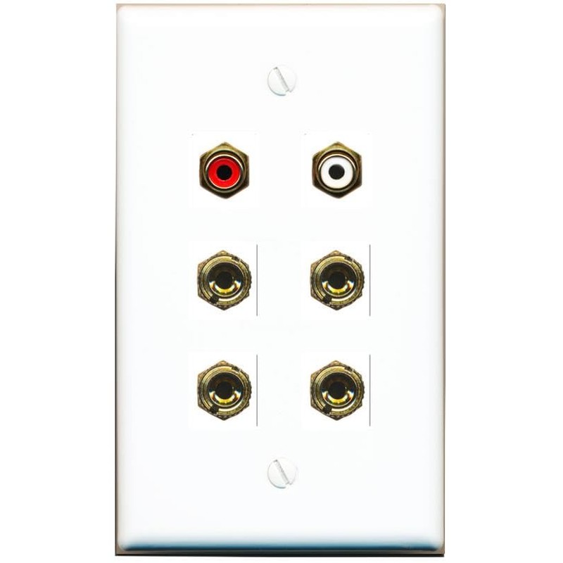 RiteAV 4 Banana (2 Speaker) Binding Post Wall Plate with 2 RCA Jacks (Red+White) - Flat Style [White]