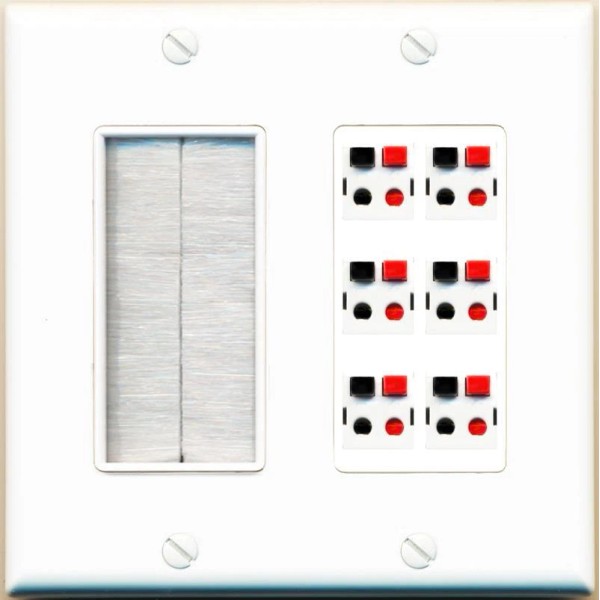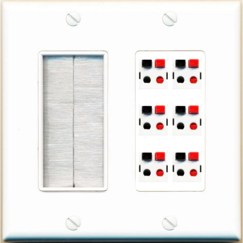 RiteAV 6 Port Speaker Wire Plug Jack Wall Plate - Brush [White]