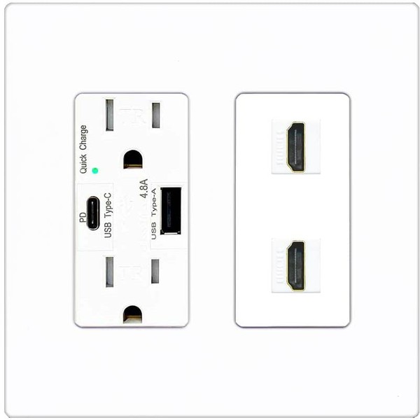 RiteAV HDMI Wall Plate 2 Port - USB A+C Charger [Screwless White]