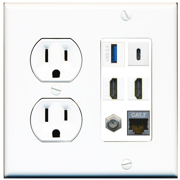 RiteAV USB 3 USB C 2 HDMI Coax Cat7 Wall Plate - Round Outlet [White/White]