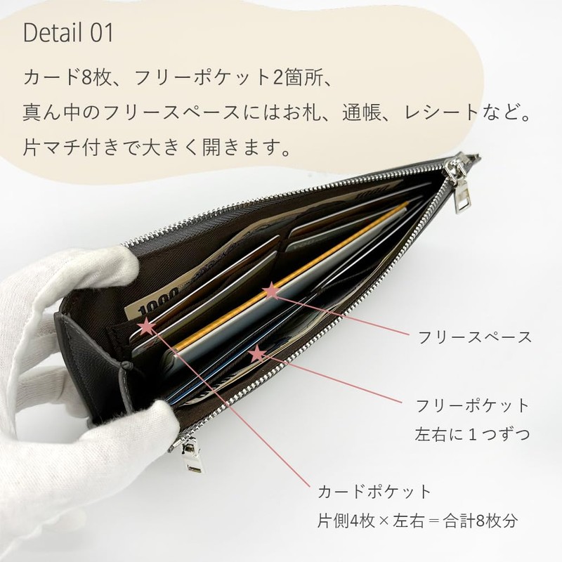 - The outer pocket can be used to store coins, etc. It has a single gusset that opens wide so you can easily see the contents of the items and take them out easily