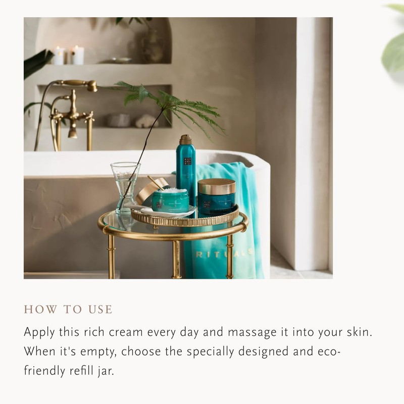 - How to use: Apply the Rituals body cream daily by gently massaging into the whole body. When empty, use the specially designed eco-friendly refill pack to top up
