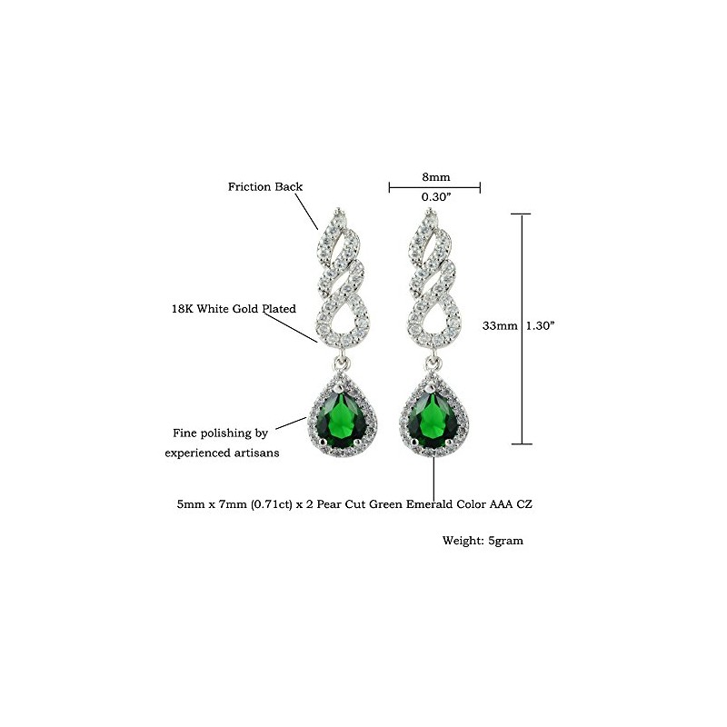 - Metal and gemstones: environmentally friendly brass (nickel-free) with 18K white gold plated. Green emerald colour (can be birthstone) are used. Main gemstone size is 5 mm x 7 mm x 1