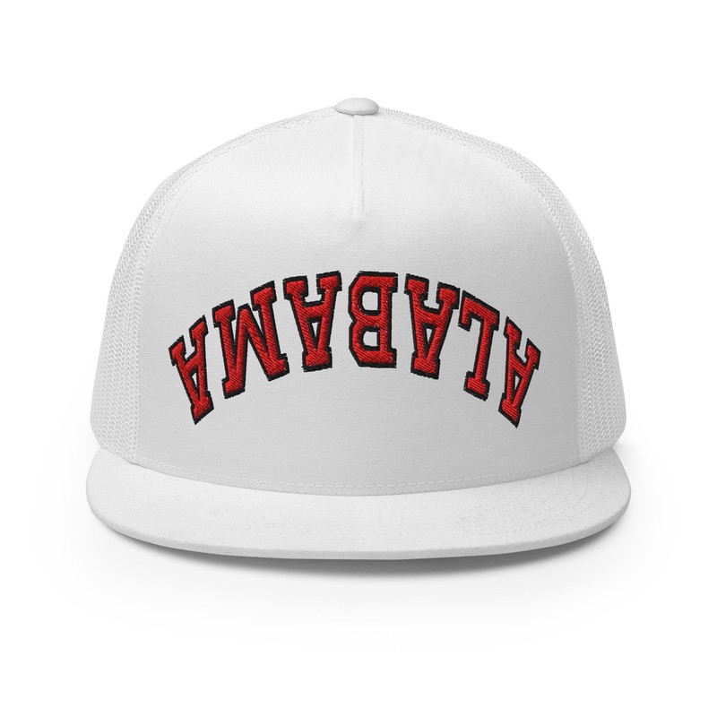 - THE ALABAMA UPSIDE DOWN FLAT BILL TRUCKER HAT: is a high-quality and well-crafted accessory that is sure to turn heads. Made with premium materials, it is comfortable to wear and designed to last. The adjustable closure ensures a perfect fit for allmost all head sizes.
