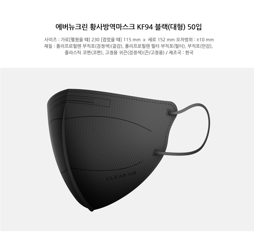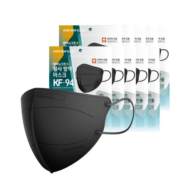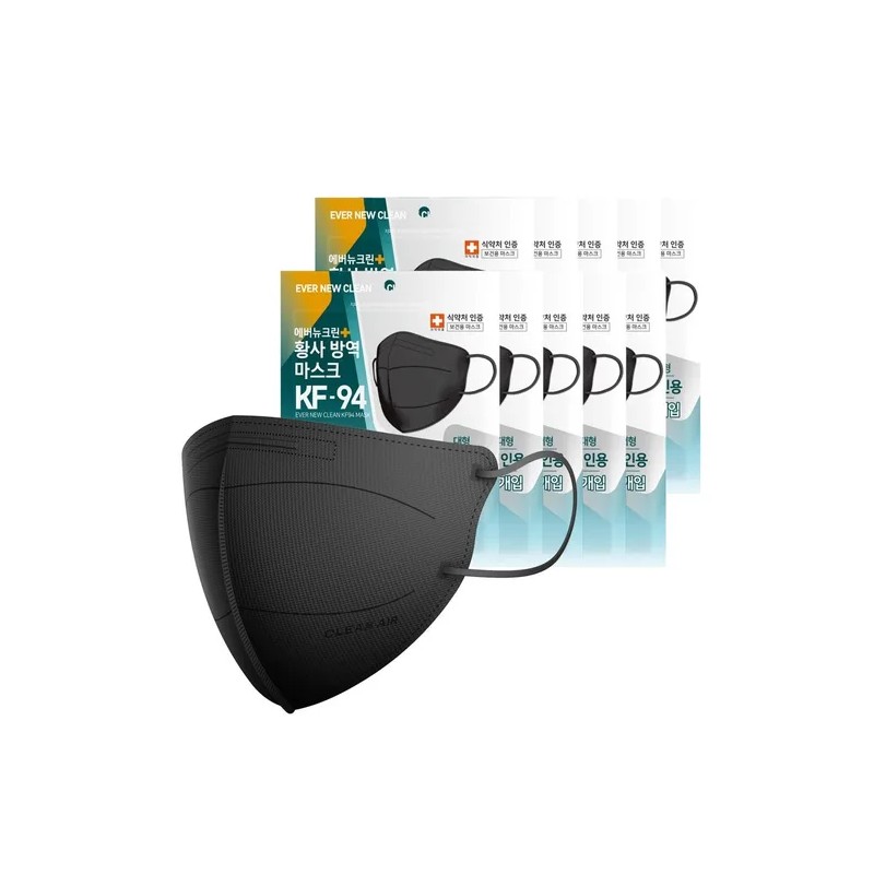 - Product Name and Model: Evernew Clean Yellow Dust Prevention Mask (KF94)(Black/Large) 50 pcs 2D/Flat Type