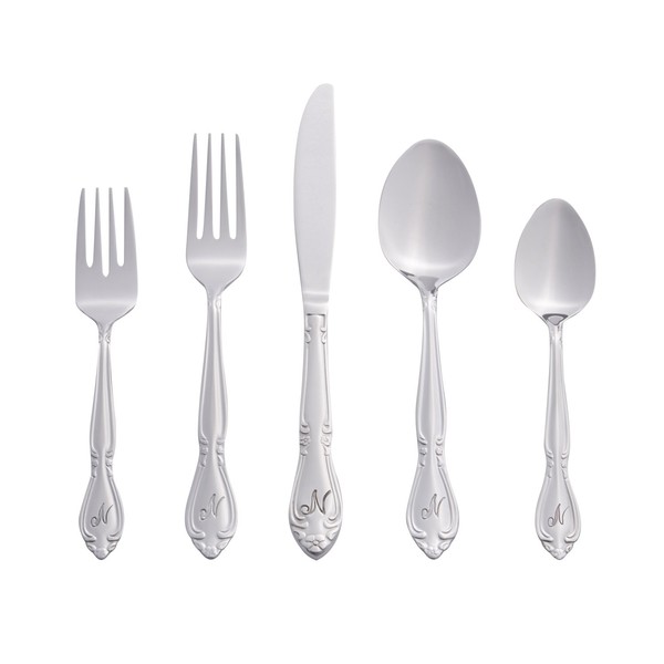 RiverRidge Rose Monogrammed Flatware Set 46 Piece Silverware - N - Utensils Set with Serving Pieces, Heavy Gauge Stainless Steel, Mirror Finish, Dishwasher Safe Cutlery for Daily Use