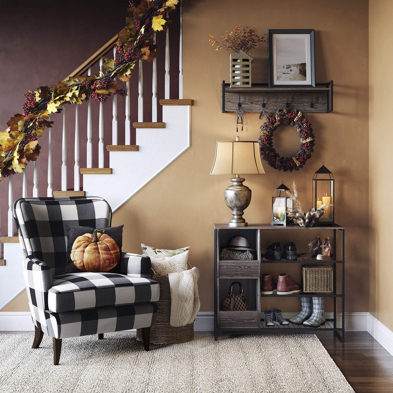- Weathered woodgrain veneer, black metal frames and dark brown coat hooks add simple, contemporary Charm to any space.