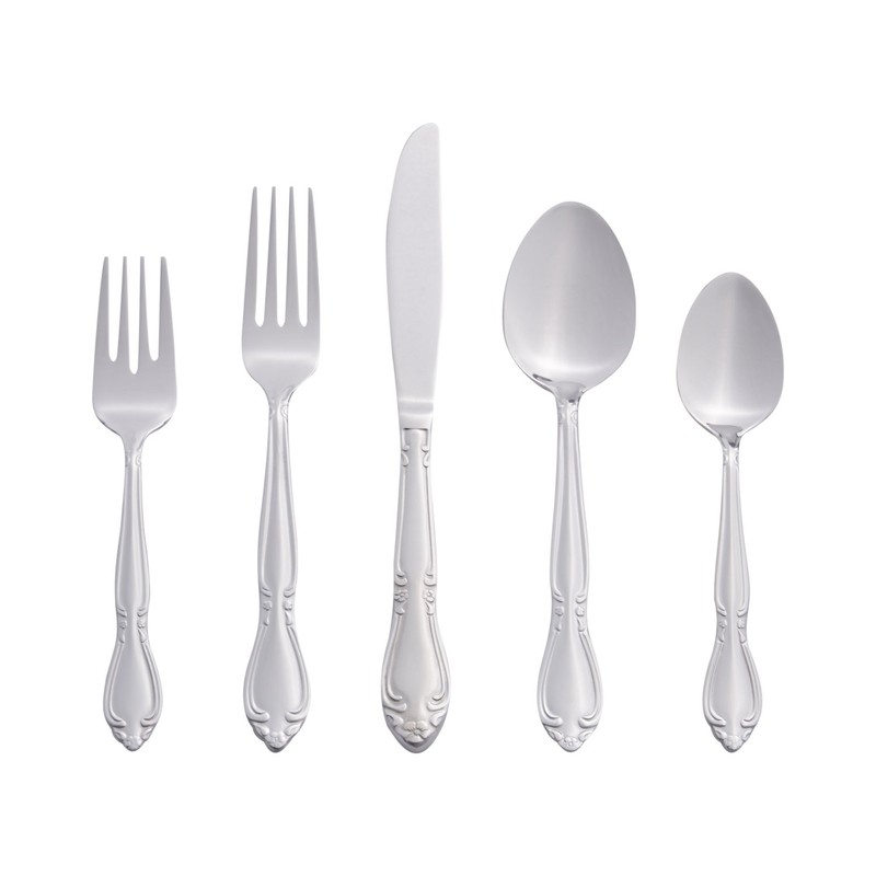 • Service for eight (dinner fork, dinner spoon, salad fork, teaspoon, dinner knife) and 6 serving pieces (serving spoon, slotted serving spoon, gravy ladle, serving fork, butter knife, sugar spoon)