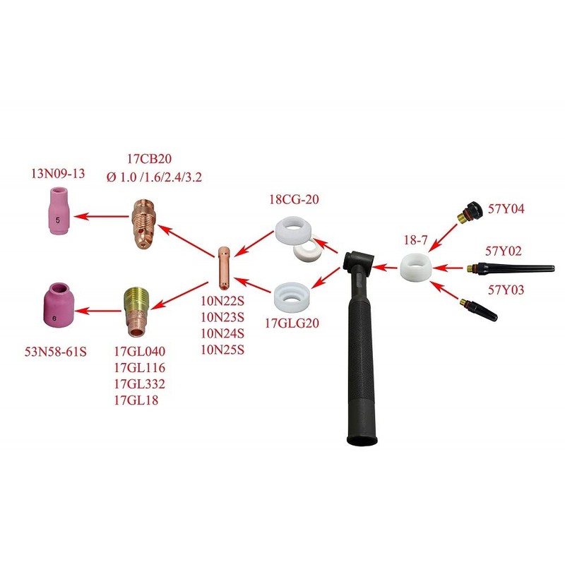 • Arbeit mit 10N22S 10N23S 10N24S 10N25S tig Spannzange und 53N58 53N59 53N60 53N61 53N61S Keramik-Cup