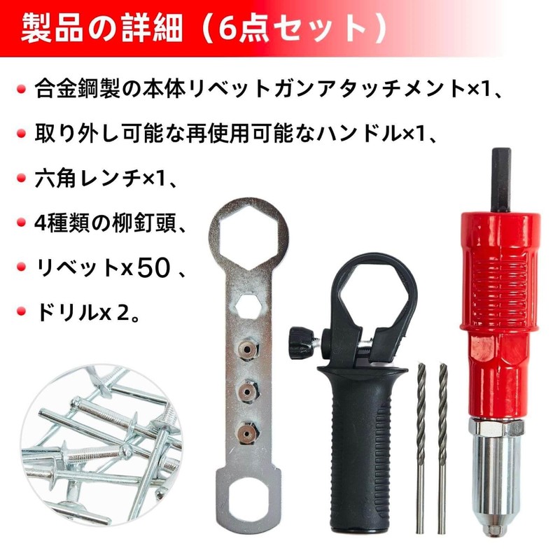 - [Built-in contents] Alloy steel main unit rivet gun attachment x 1, removable reusable handle x 1, hex wrench x 1, 4 types of willow head x 50, rivet x 2