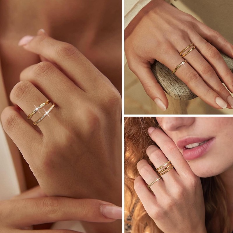 - Gold stacking rings: petite gold stacking rings for women set comes with 4 pieces rings in different designs. Gold and silver colours to choose from. Women's gold rings that do not tarnish are simple and fashionable. Stackable rings are suitable for most people