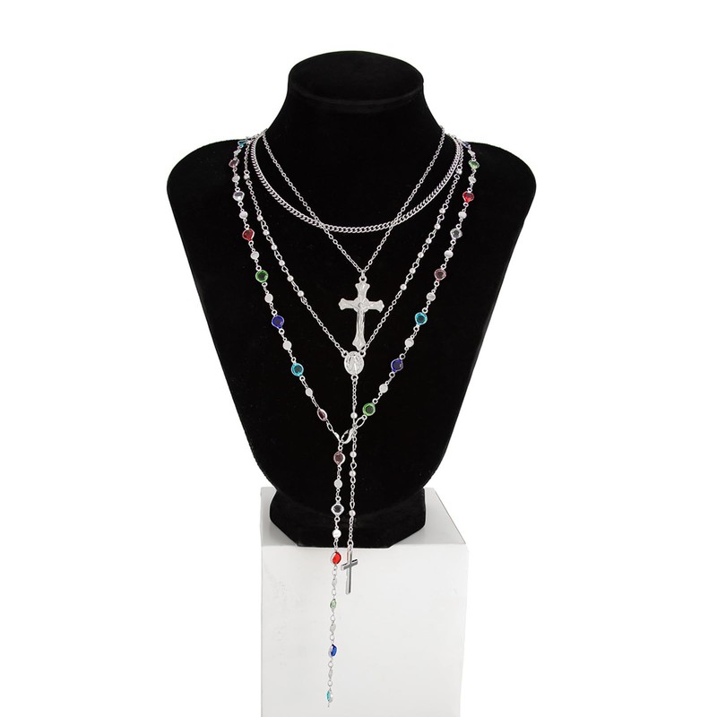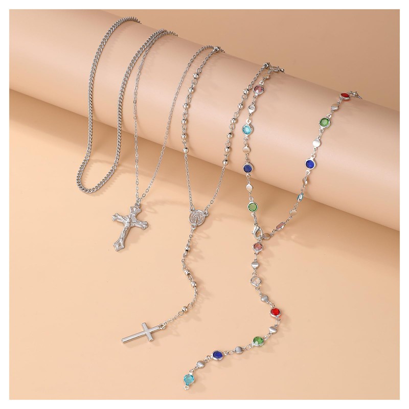 Riymusry 4Pcs/set Colorful Crystal Bead Necklace for Women,Statement Cross Pendant Clavicle Necklace,Summer Y Shape Long Tassel Chest Chain Jewelry,Wedding Layered Rhinestone Neck Chain (Silver)