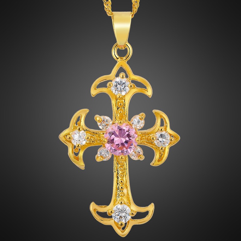 RIZILIA Crucifix Cross Pendant with 45cm(18") Chain & Round Cut Gemstones CZ [Pink Sapphire] in 18K Yellow Gold Plated, Simple Modern Elegance