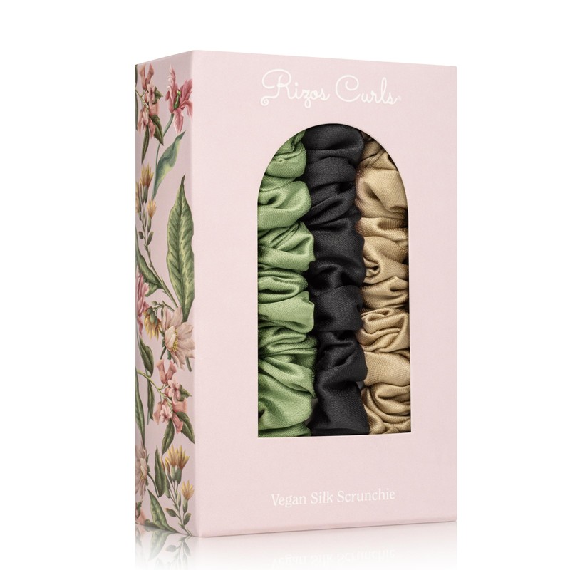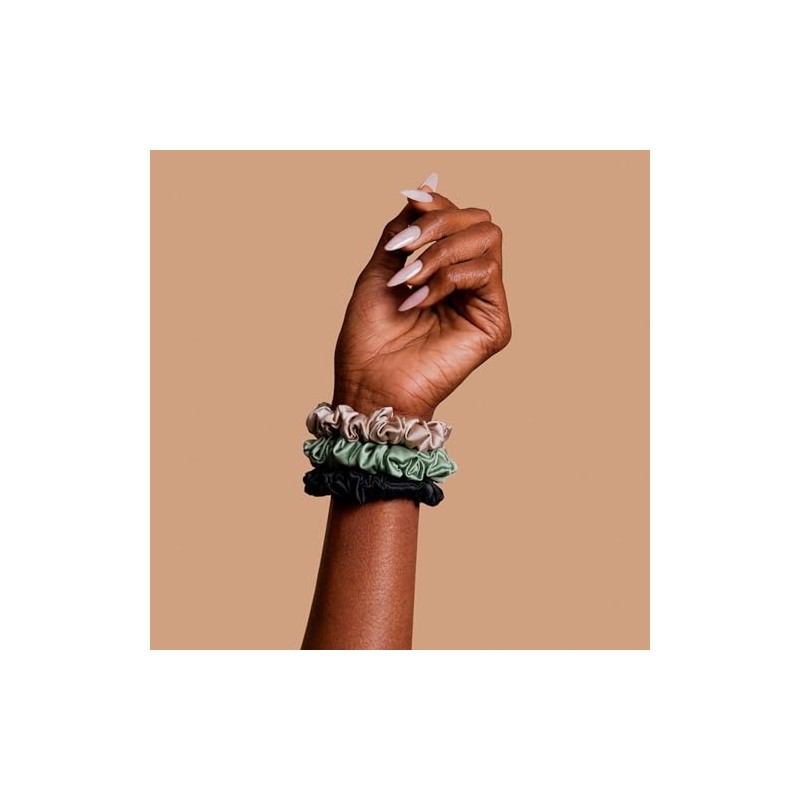 - The Vegan Silk Mini Scrunchies are available in 3-packs of black, nude, sage green or multicolor(1-black, 1-sage green, 1-nude)