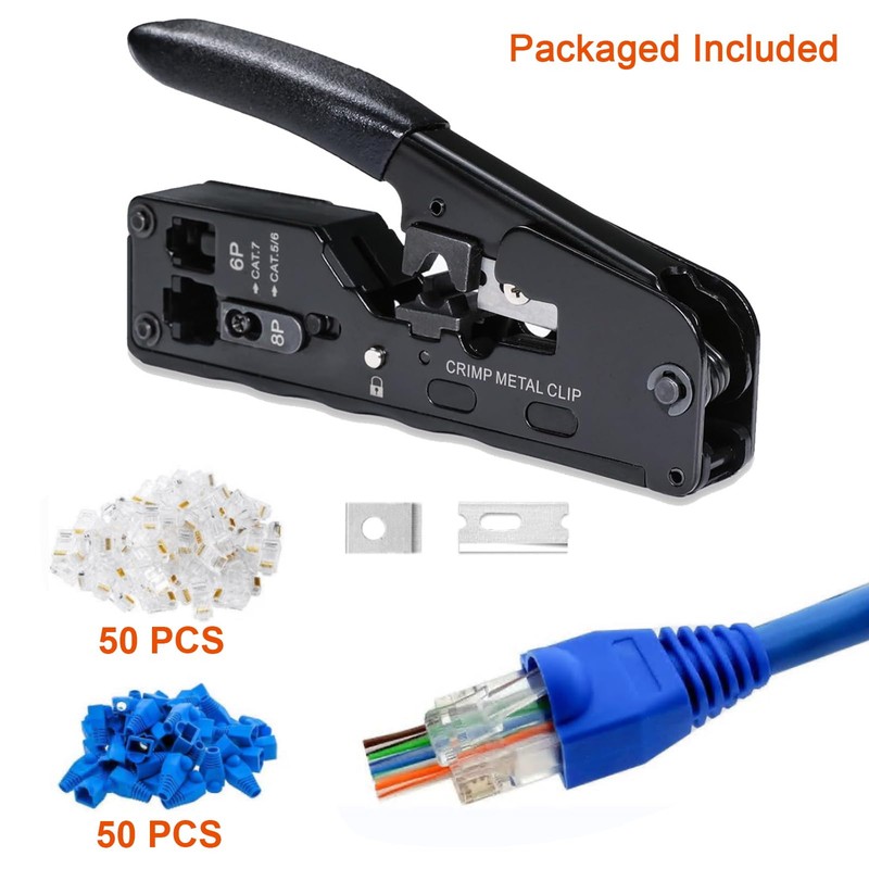 RJ45 Crimping Tool Set, All-in-One Ethernet Crimping Pliers, Wire Stripper for Cat5e, Cat6, Cat6a, Through Connector with 50 RJ45 Connectors and 50 Covers, 1 Mini Wire Stripper