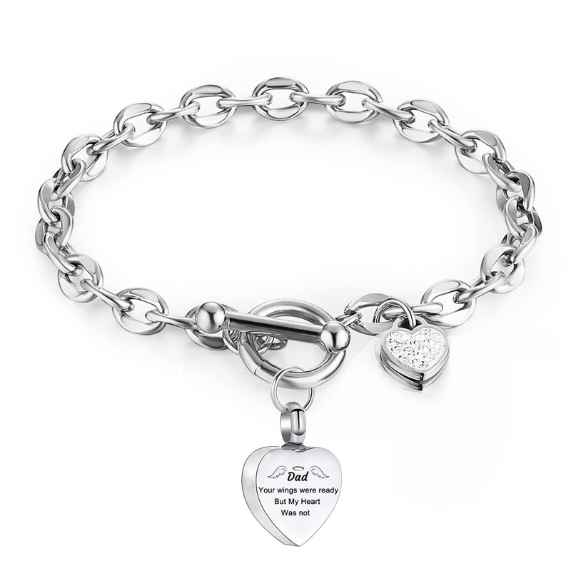 - Size – Ashes heart pendant size: 0.79" * 0.79". The bangle link chain size is: 7.87 inches (20cm), suitable for all age group people. It is very sturdy and comfortable for all day wearing, Beautifully inscribed with a touching saying”Dad,your wings were ready my heart was not”.