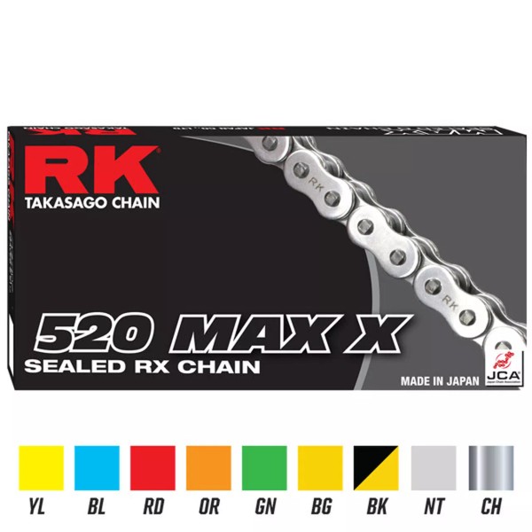 The RK MAX-X is a premium RX-ring sealed chain offered at the most competitive price possible. Available in multiple colors and a wide range of lengths for mid to large displacement machines, including up to 160 links for extended swingarms the RK MAX-X 520 Chain is the perfect choice for your next chain. Most modern sportbikes will need a 120 link chain which allows for most common sprocket combinations. That said there are exceptions to this so do your research before you order or as always feel free to call Team STG and let us do the research for you.