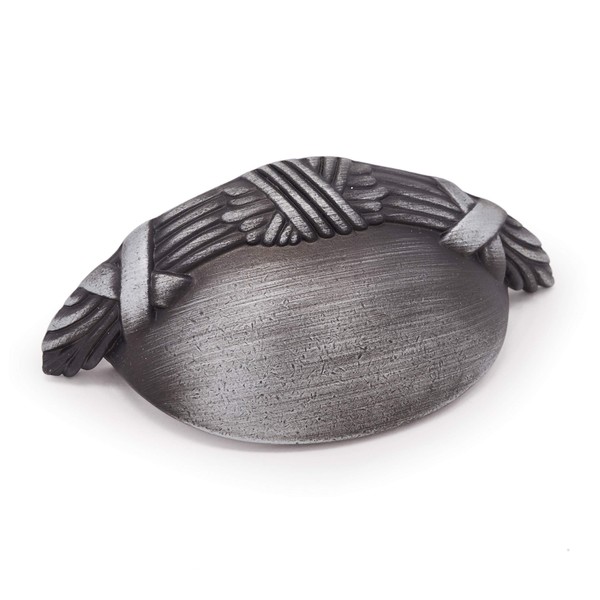 3 5/8 inch x 1 5/8 inch x 1 5/16 inch Distressed Nickel lines & crosses @ edge cup pull. Finish type name: Distressed Nickel. Country of origin: Taiwan. From the brand name: R.K. International