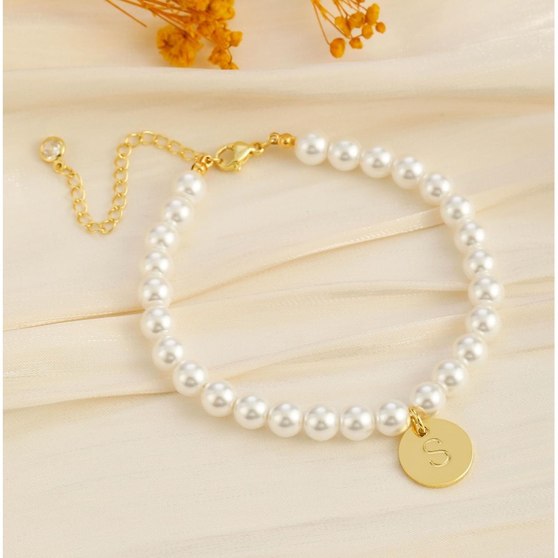 - DAINTY PEARL BRACELET: This dainty initial bracelet features small round glass pearl beads and shiny disc letter charms. The overall appearance is a modern minimalist display of absolutely beautiful pearls and polished findings that is worthy of any occasion from casual to formal.