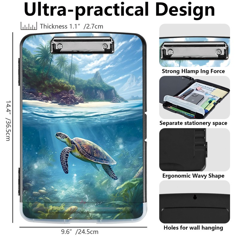 RMJKXQZG Plastic Clipboard with Storage & Sticky Notes - A4 Storage Clipboard High Capacity Clipboards with Office Storage Nursing Clipboard Clip Board with Pen Holder, Beach Coconut Tree Cute Turtle