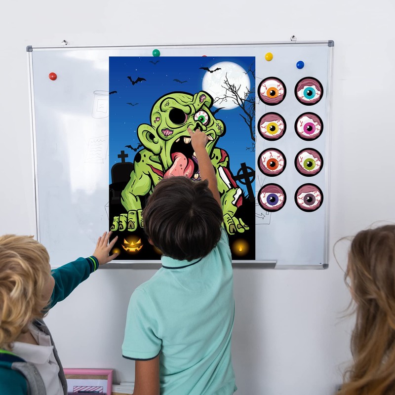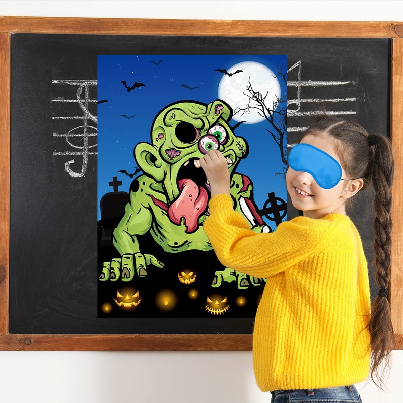 - EASY TO PLAY: First, you need to stick the poster on a wall or a board. Second, players choose their eyeball stickers and wear the blinder, then try to stick the eyeball on the zombie. Who sticks much closer, who will win the game!