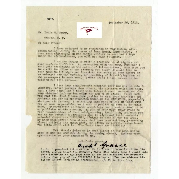 GRACIE IS NOW (SEPTEMBER 1912) WORKING ON HIS BOOK, "THE TRUTH ABOUT THE TITANIC," AND HE IS ASKING OGDEN TO PROVIDE HIM WITH SOME OF HIS PHOTOS FOR THE FORTHCOMIG BOOK.