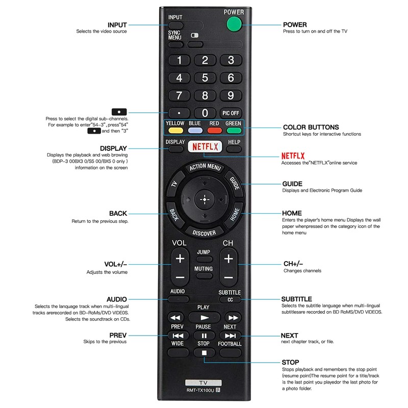 - 【Same as original sony tv remote control】RMT-TX100U Replacement sony remote control is 100% identical to the original sony remote control and covers all functions, making it ideal for when you need to replace your original sony tv remote control.