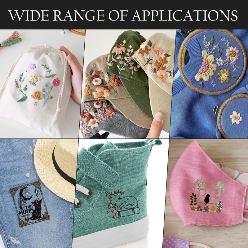 - Wide Applications: Stick and sew embroidery paper can be used on clothing, jeans, hats, bags, throw pillows, shoes, tablecloths, and other items, making them more attractive