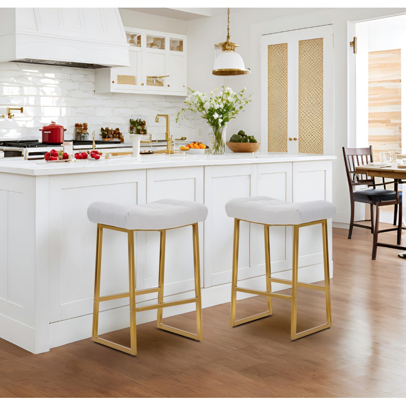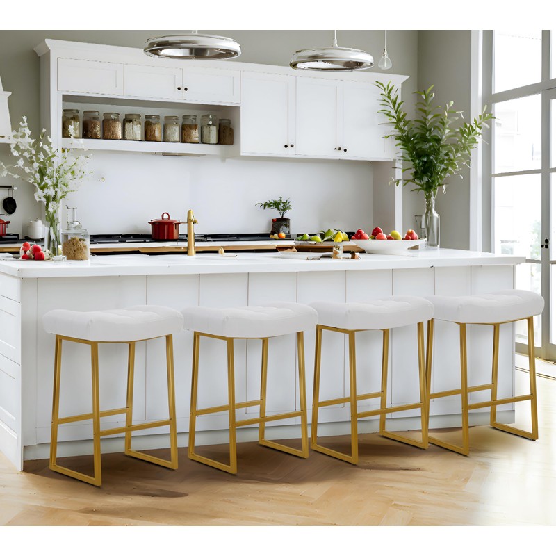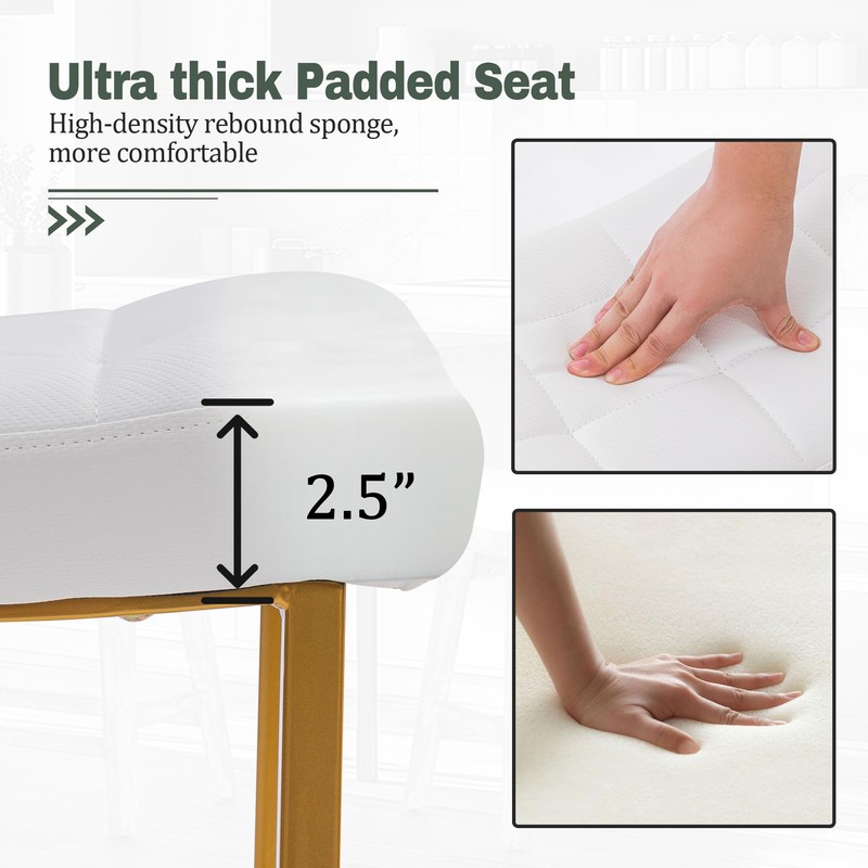 • Luxury Gold Sturdy & Stylish Counter Stool - Solid metal frame with built-in footrest makes the counter stool more sturdy, and could be used for years without problem. Nicely stitched faux leather with matte black powder-coated steel base, the modern and minimalist design of the bar stool fits in with both contemporary and traditional decor. The non-slipped foot pads of the kitchen stools also protect the floor from being scratched