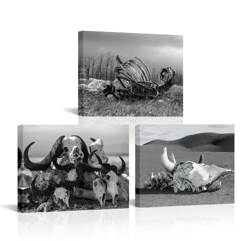 RnnJoile Animal Skull Canvas Art Picture Black and White Western Painting Framed Each Piece 12x16 Inch
