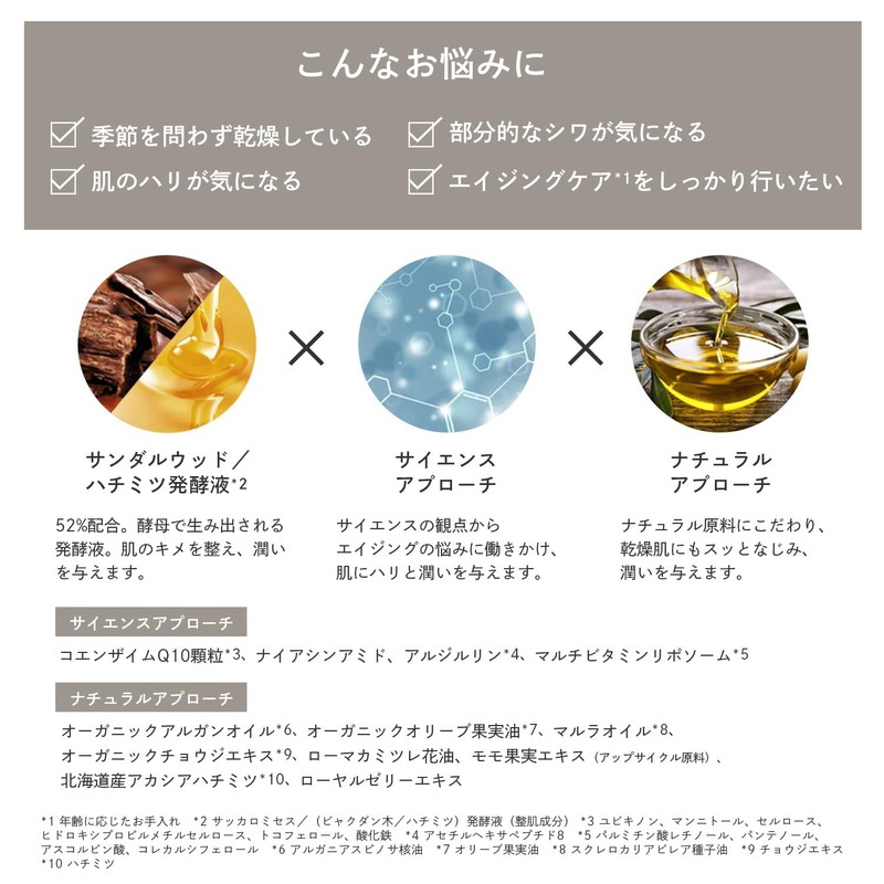 - Natural Approach: Organic argan oil, organic olive fruit oil, mala oil, organic mala oil, organic malt extract, roman kamisle flower oil, peach fruit extract (upcycle ingredient), acacacia honey produced in Hokkaido, royal jelly extract